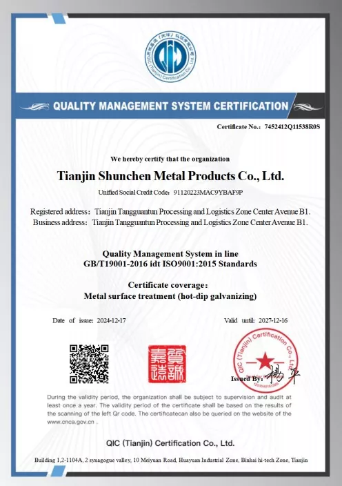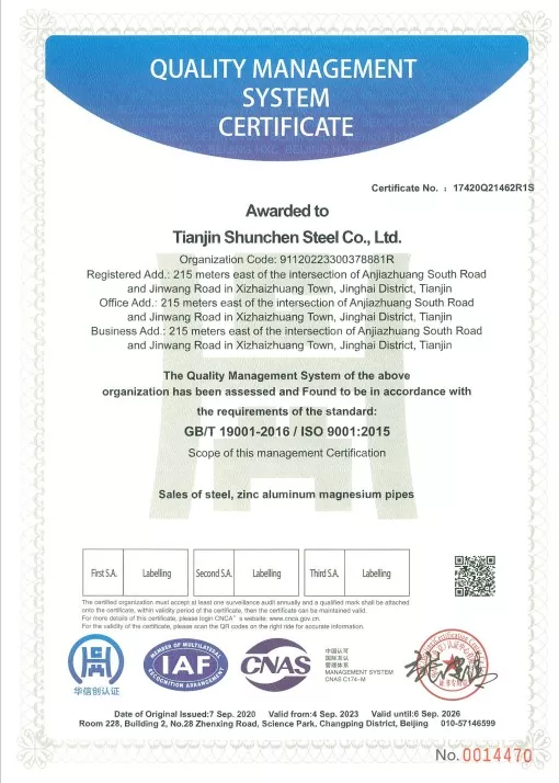 Πρότυπα: GB/T 3091-2015 "Welded Steel Pipes for Low-Pressure Fluid Transportation", GB/T 13912-2020 "Hot-Dip Galvanized Steel Tubes". Το προϊόν έχει περάσει δοκιμές τρίτων και έχει μια αναφορά δοκιμής.