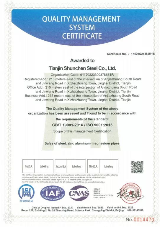 Η Shunchen Industrial's Steel U Section έχει λάβει πιστοποίηση ποιότητας ISO9001, πληρώντας τα εθνικά πρότυπα. Παρέχουμε αναφορές δοκιμών υλικών τρίτων και πιστοποιητικά πάχους γαλβανισμού. Η παραγωγή μας χρησιμοποιεί προηγμένες γραμμές παραγωγής, που υποβάλλονται σε 12 αυστηρά στάδια διαδικασίας, ενισχύονται από πάνω από 20 χρόνια τεχνογνωσίας στην παραγωγή. Έχουμε διατηρήσει ένα ιστορικό 12 ετών μηδενικών παραβιάσεων συμβολαίων και μηδενικών ετήσιων περιστατικών ποιότητας. Κατά τη διαδικασία παραγωγής, εφαρμόζονται τρεις επεξεργασίες παθητικοποίησης για την ενίσχυση της αντιαλκαλικής αντοχής των γαλβανισμένων προϊόντων. Κάθε τελικό προϊόν υφίσταται ξήρανση, επιθεώρηση και φινίρισμα πριν συσκευαστεί και αποσταλεί. Η εταιρεία διαθέτει πιστοποιήσεις συστήματος ISO 9000, 3A και πιστοποίηση EU CE. Με τα 12 βήματα της διαδικασίας μας και έναν ολοκληρωμένο μηχανισμό επιθεώρησης τριών επιπέδων, πετύχαμε μηδενικά ετήσια περιστατικά ποιότητας και ασφάλειας και διατηρήσαμε 12 χρόνια ρεκόρ μηδενικών παραβιάσεων συμβολαίων.