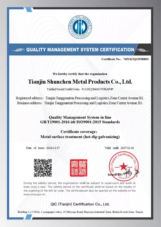 Επιλέξτε Shunchen για αξιόπιστη ποιότητα. Χρησιμοποιούμε χάλυβα υψηλής ποιότητας Q235B ή Q355B, επεξεργασμένο μέσω γαλβανισμού εν θερμώ για αντοχή στη διάβρωση. Η θερμοκρασία του δοχείου ψευδαργύρου ελέγχεται με ακρίβεια εντός της περιοχής 450-460 βαθμών Κελσίου για να εξασφαλίσει ισχυρή πρόσφυση της επίστρωσης ψευδαργύρου και να μην χάνονται περιοχές. Τα προϊόντα μας συμμορφώνονται με την πιστοποίηση συστήματος ποιότητας ISO9001 και υποστηρίζονται από αναφορές επιθεώρησης επίστρωσης ψευδαργύρου τρίτων κατασκευαστών.